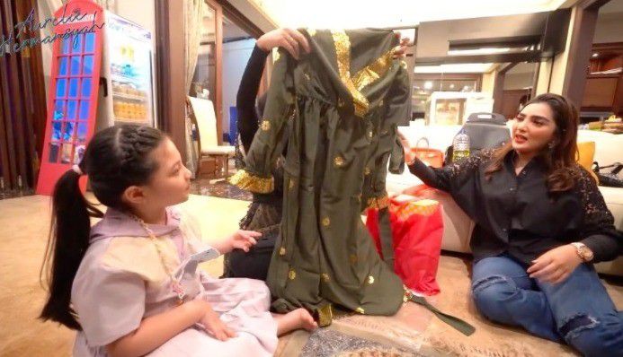 "Ini bajunya dia yang pilihan di online shop yang pas sama kamu, katanya," ungkap Ashanty. Rupanya, Aurel mendapatkan sebuah kaftan berwarna hijau yang dihiasi aksen tenun emas dari Arsy dan Arsya.