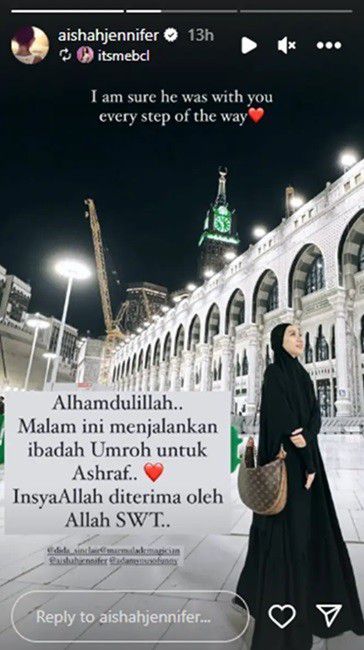 Membagikan ulang foto BCL di Tanah Suci, Aishah menyebut mendiang kakaknya selalu mengiringi langkah BCL. "Aku yakin, dia (Ashraf Sinclair) selalu bersamamu di setiap langkahmu," balas Aishah.