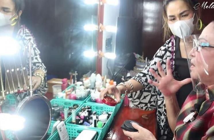 Sementara di sudut kamar tidur ada meja rias Mpok Atiek yang penuh dengan make up. Ada juga lampu meja rias.