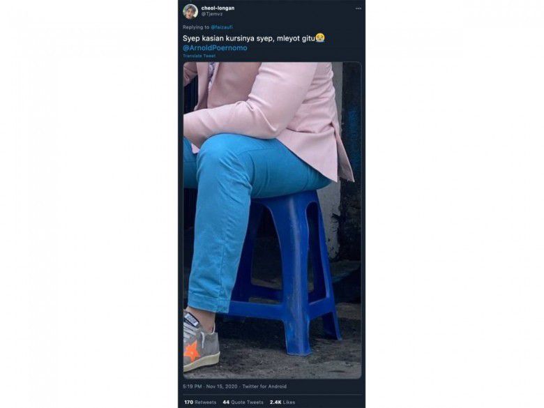 Ada juga warganet lain yang malah ngomentarin kursi plastik yang tengah diduduki Chef Arnold. "Syep, kasiyan kursinya syep, mleyot begitu," katanya dengan diakhiri emoticon nangis.