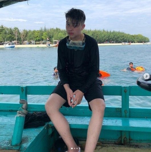 Wajah manis Baim tampak makin ganteng setelah berenang saat dia menikmati liburannya.