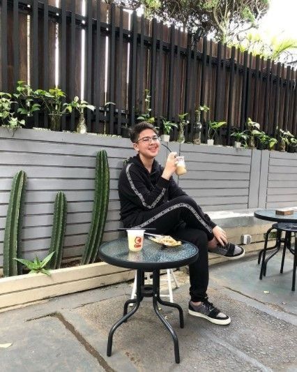 Baim terlihat seperti remaja zaman now yang menikmati es kopi.