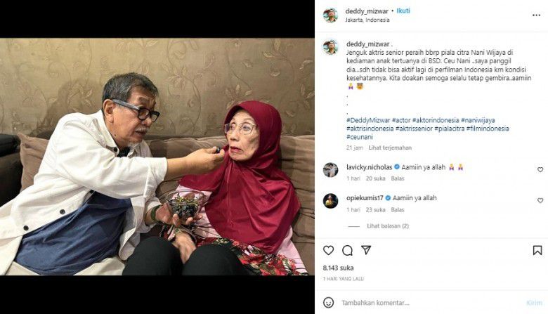 “Jenguk aktris senior peraih beberapa Piala Citra, Nani Wijaya di kediaman anak tertuanya di BSD. Ceu Nani, saya panggil dia sudah tidak bisa aktif lagi di perfilman Indonesia karena kondisi kesehatannya. Kita doakan semoga selalu tetap gembira aamiin,” tulis Deddy Mizwar.