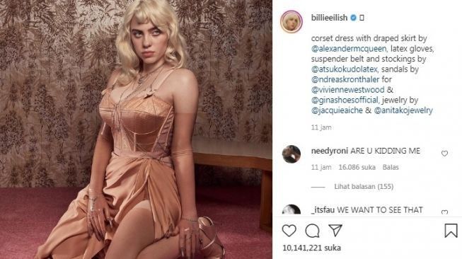 Billie Eilish mengunggah di akun Instagram pribadinya dengan baju korset ketat yang menonjolkan lekuk badannya. Rambutnya yang di cat pirang senada dengan warna pakaian yang dikenakannya.