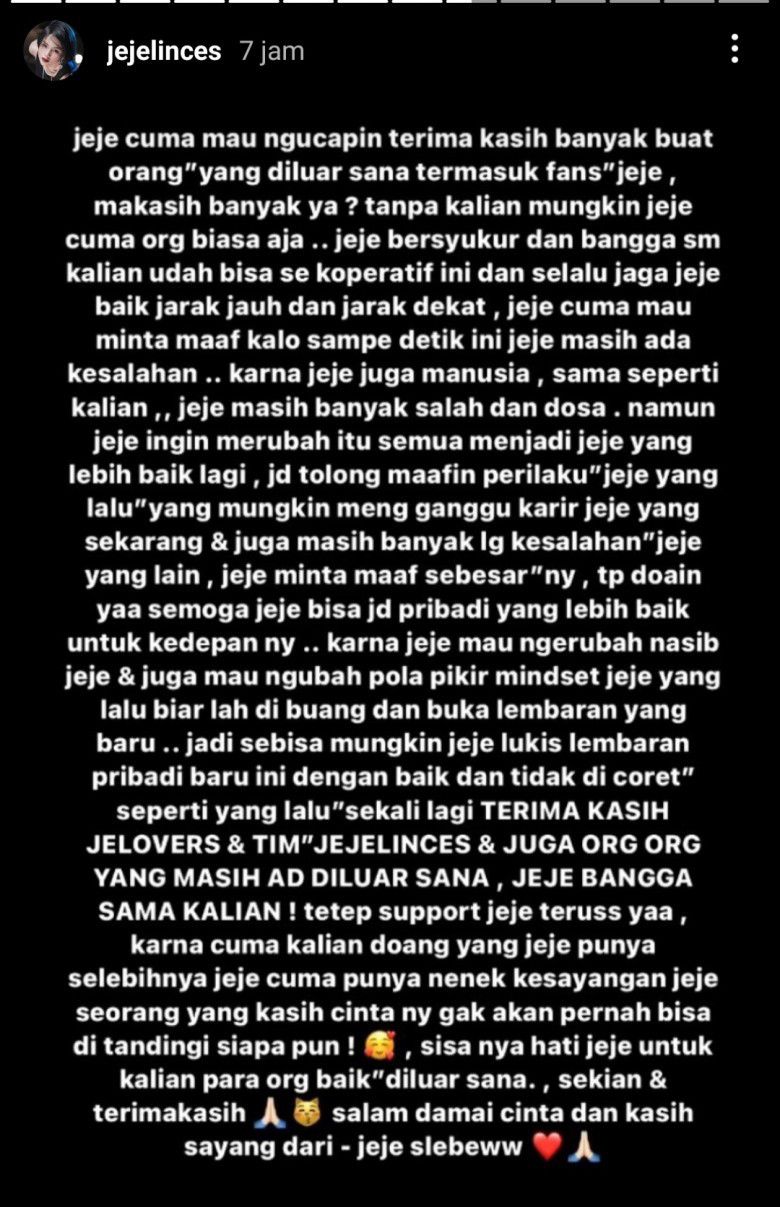 “Jeje cuma mau minta maaf kalo sampai detik ini Jeje masih ada kesalahan, karena Jeje juga manusia, sama seperti kalian, Jeje masih banyak salah dan dosa. Namun Jeje ingin merubah itu semua menjadi Jeje yang lebih baik lagi,” tulis Jeje Slebew dalam unggahannya dengan latar hitam.