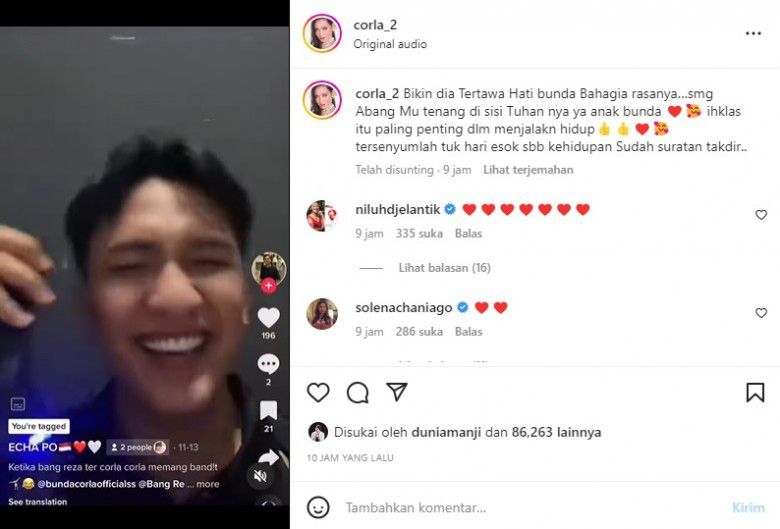 "Bikin dia (Reza) tertawa hati bunda bahagia rasannya...semoga Abang mu tenang di sisi Tuhan nya ya anak bunda," ujar Bunda Corla di bagian caption video Reza Hutabarat yang diunggah di Instagramnya pada Jumat, 2 Desember 2022.