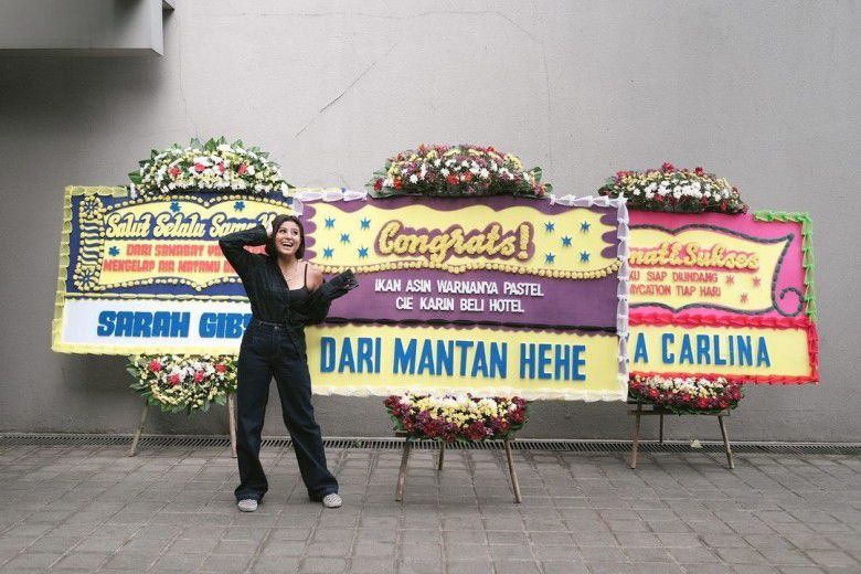 Mendapatkan ucapan karangan bunga yang unik, Karin berterima kasih kepada para sahabatnya.