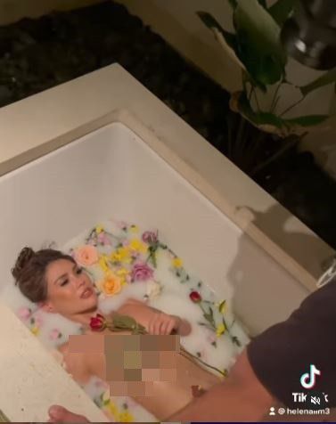 "Behind the scene before shoot #tiktok helenalim3. Play with susu cair, my first time mandi susu rasanya lengket semua," tulis Helena Lim.