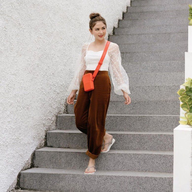 Sedangkan untuk bawahannya, Jessica Mila memilih mengenakan celana bahan velvet warna cokelat yang membuat gayanya makin modis.