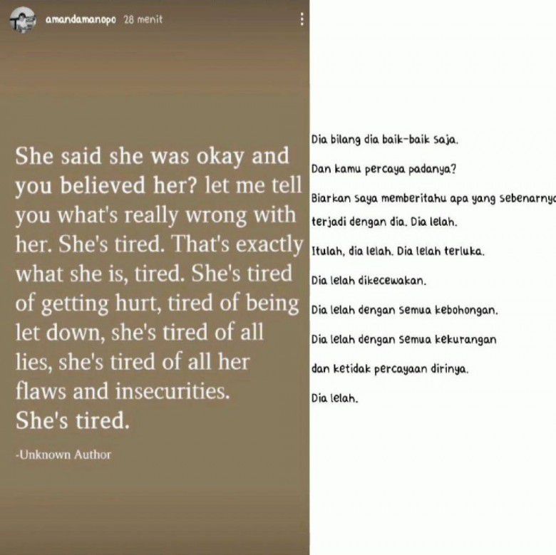 Bak sudah muak dengan segala pemberitaan, Amanda menuliskan pesan mendalam di Instagram Storiesnya. Ia menulis jika seseorang yang terlihat baik-baik saja belum tentu dirinya tak punya masalah. Ia juga mengungkapkan jika dirinya lelah dengan segala hal menyakitkan.