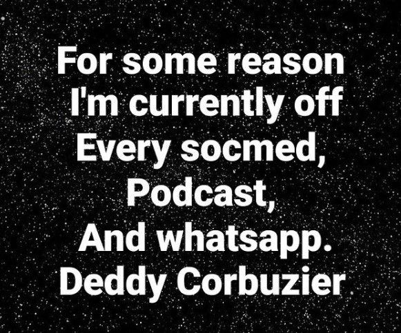 Deddy Corbuzier mendadak memberikan pengumuman penting di Instagram pribadinya, @mastercorbuzier. Deddy mengatakan jika saat ini ia memutuskan untuk berhenti aktif dari beberapa platform sosial media, dari mulai Instagram, YouTube, hingga WhatsApp.