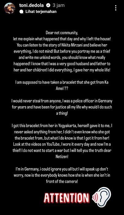 "Aku tidak akan pernah mencuri dari siapa pun, aku pernah menjadi polisi di Jerman selama beberapa tahun dan mengabdi pada keadilan seumur hidupku, mengapa aku harus melakukan hal itu," tulis Toni Dedola dengan bahasa Inggris dan latar hitam.
