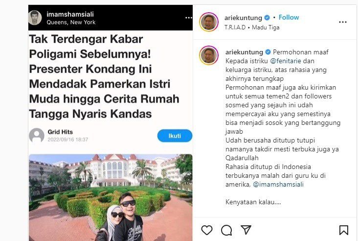 Dalam postingan itu memang seolah-olah Arie diduga telah berpoligami. “Duh malu ngomongnya, belum berani ngasih tahunya,” tulisnya lagi. Namun Arie pun akhirnya memberikan konfirmasi bahwa dirinya sama sekali tidak berpoligami atau menduakan Fenita.