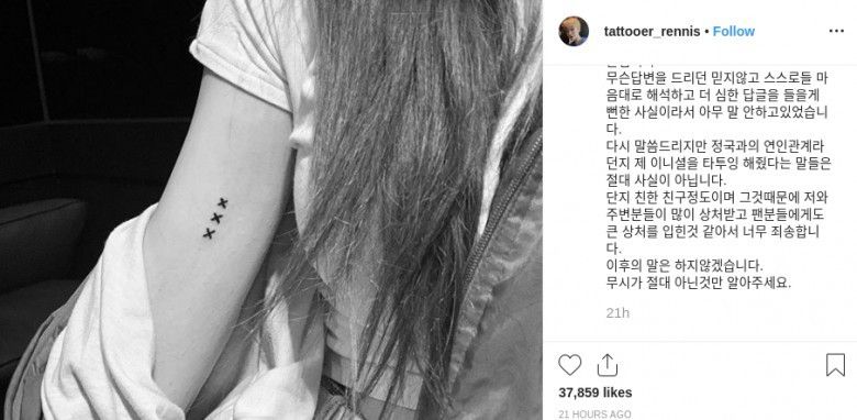 Saya ingin sekali lagi menyatakan bahwa sama sekali tidak benar kalo saya berkencan dengan Jungkook atau bahwa saya menato inisial nama saya padanya.