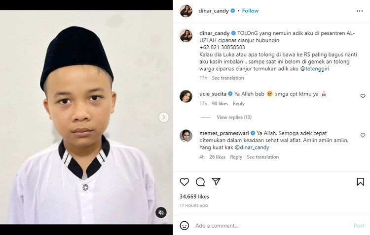 "TOLOnG yang nemuin adik aku di pesantren AL-UZLAH cipanas cianjur hubungin +62 821 30858583 Kalau dia Luka atau apa tolong di bawa ke RS paling bagus nanti aku kasih imbalan .. sampe saat ini belom di gemek an tolong warga cipanas cianjur temukan adik aku @tetenggiri," tulis Dinar Candy di bagian captionnya.