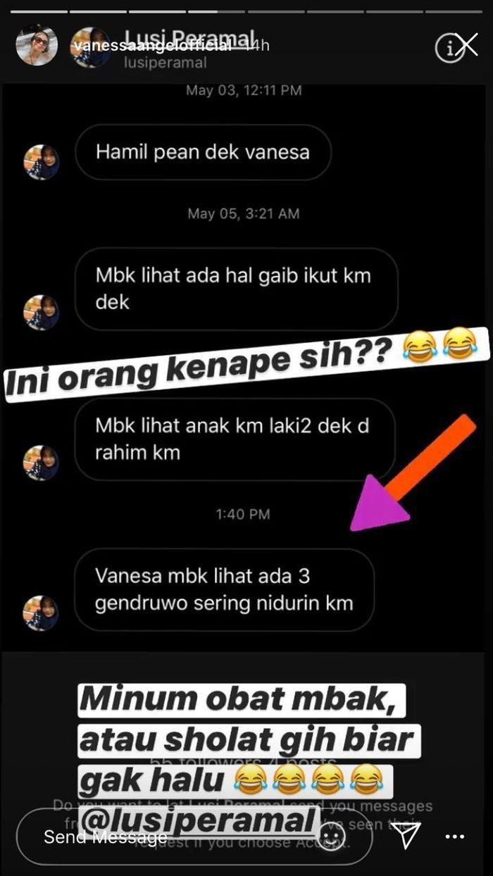 Tengah hamil, Vanessa diterpa isu miring. Dia mengunggah foto tangkapan layar di InstaStory. Sebuah DM dari seorang peramal bernama Lusi yang ngasih tahu info tentang kehamilannya.