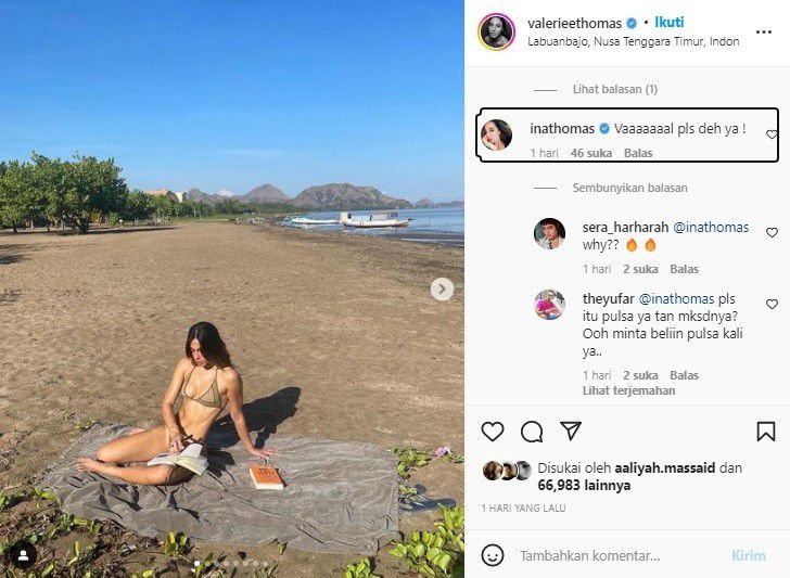 Melihat foto tersebut, sang ibu, Ina Thomas ikut berkomentar. Dia seakan menyayangkan tindakan putrinya yang memamerkan tubuhnya pada 1,2 juta pengikut di Instagramnya itu. “Vaalll pls deh ya!,” komentar Valerie Thomas.