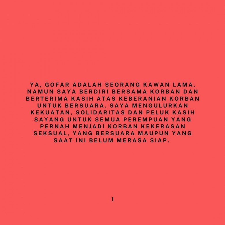 "Sangat mungkin, publik dan lingkaran sosial Gofar akan melumrahkan perilakunya. Move on ke trending topic berikutnya, dan ia akan terus berkarya tanpa mendapatkan sanksi yang berarti," tulisnya.