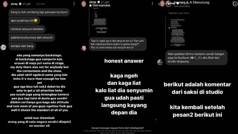 Cowok yang hobi main games ini juga menampilkan pengakuan seorang netizen yang mengaku melihat langsung sikap Reza Arap kepada Kyuhyun Super Junior saat berada di studio. "Wah padahal dirimu kemarin ramah banget juga ke Kyuhyun. Aku lihat dari studio langsung," kata si netizen. "Berikut adalah komentar dari saksi di studio. Kita kembali setelah pesan-pesan berikut ini," balas Reza Arap.