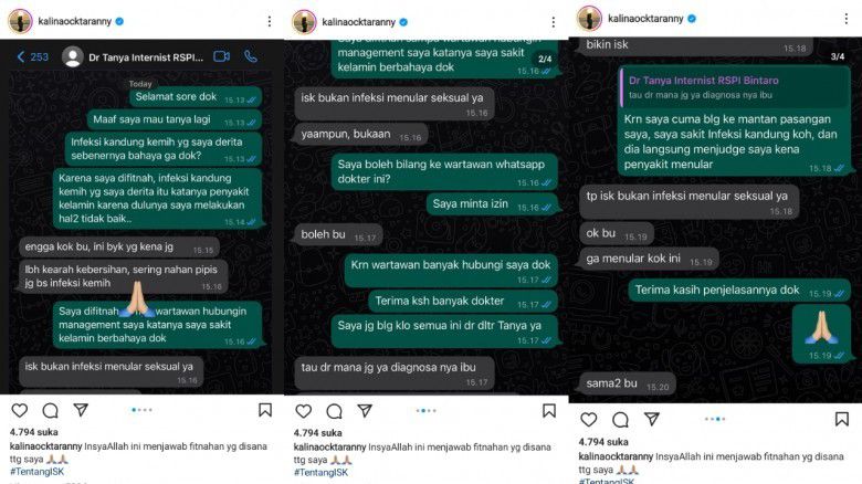 ”Infeksi kandung kemih yang saya derita sebenarnya bahaya enggak dok? Karena saya difitnah, infeksi kandung kemih yang saya derita itu katanya penyakit kelamin karena dulunya saya melakukan hal2 tidak baik," tanya Kalina Oktarani pada dokternya dalam pesan singkatnya.