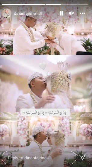 Di bagian atas, Dinan tampak mencium tangan suaminya. Sementara dua foto lainnya menunjukkan momen saat Doni Salmanan mencium keningnya. Mengiringi unggahannya itu, Dinan Fajrina menyertakan ayat Al-Qur’an yang diambil dari Surat Al-Insyirah yang ditulisnya dengan menggunakan huruf Hijaiyah, yang berbunyi, ‘Fainna ma'al 'usri yusran. Inna ma'al 'usri yusran.’