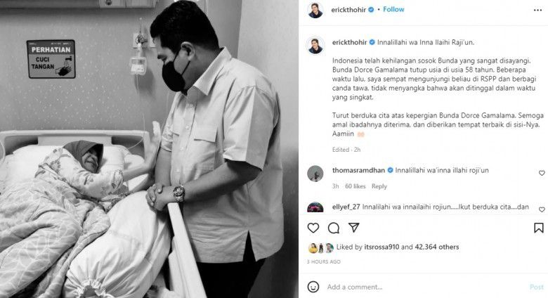 Mengiringi unggahannya, Erick Thohir mengenang kembali pertemuannya dengan Dorce Gamalama. Dia tidak menyangka kalau canda tawa mereka kala itu akan menjadi yang terakhir untuknya. Tidak lupa, dia juga memanjatkan doa untuk mendiang Dorce Gamalama.