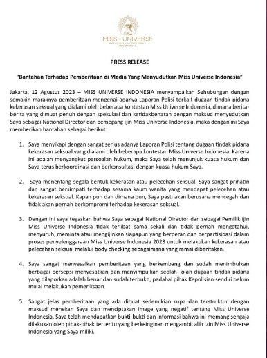 “Sangat jelas pemberitaan yang ada dibuat sedemikian rupa dan terstruktur dengan maksud menekan saya dan menciptakan image negatif tentang Miss Universe Indonesia. Saya telah mendapatkan bukti-bukti dan informasi bahwa ini memang sengaja dilakukan oleh pihak-pihak tertentu yang berkeinginan mengambil alih izin Miss Universe Indonesia yang saya miliki,” tulis Poppy.