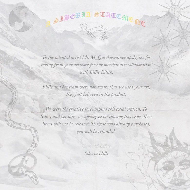 "Kepada artis bertalenta, Mr. M_Qurokawa, kami meminta maaf karena mengambil artwork Anda untuk kolaborasi merchandise kami dengan Billie Eilish," tulis SIberia Hills.