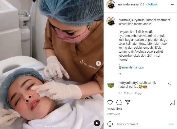 "Tutorial treatment kecantikan mama andin Penyuntikan istilah medis nya/penambahan vitamin E untuk kulit bagian dalam di pipi dan dagu ..biar kelihatan tirus.. bibir biar tidak kering dan selalu lembab.. Efek samping di Awalnya agak sedikit lebam/bengkak skitr 2/3 hr sdh normal @amandamanopo," demikian bunyi caption yang ditulisnya.