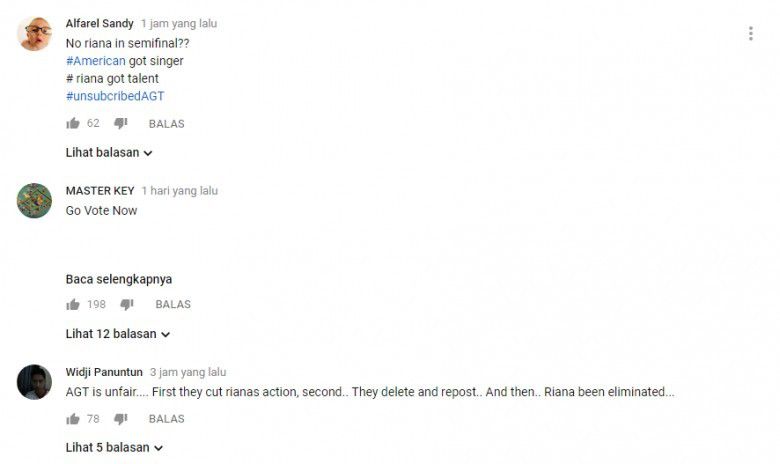 "AGT is unfair. First they cut rianas action. Second, They delete and repost. And then, Riana been eliminated (AGT tidak adil. Pertama, mereka memotong aksi Riana (di video). Kedua, mereka menghapus rekaman tersebut (di YouTube). Lalu, Riana pun tereleminasi)," tulisnya.
