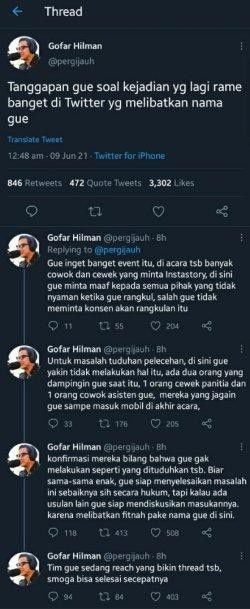 Maraknya berita tersebut, Gofar Hilman akhirnya buka suara menanggapi tudingan tersebut. Gofarmengungkapkan bahwa dia masih mengingat acara yang dimaksud, namun dia membantah melakukan pelecehan seksual seperti yang dituduhkan.