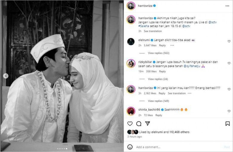 Dalam unggahannya, Haris Vriza, terlihat membagikan foto pernikahannya dengan Syifa Hadju, mulai dari memamerkan buku nikah hingga mengecup kening. Bahkan, El Rumi, sampai membalas di kolom komentar yang membuat warganet turut menanggapi.