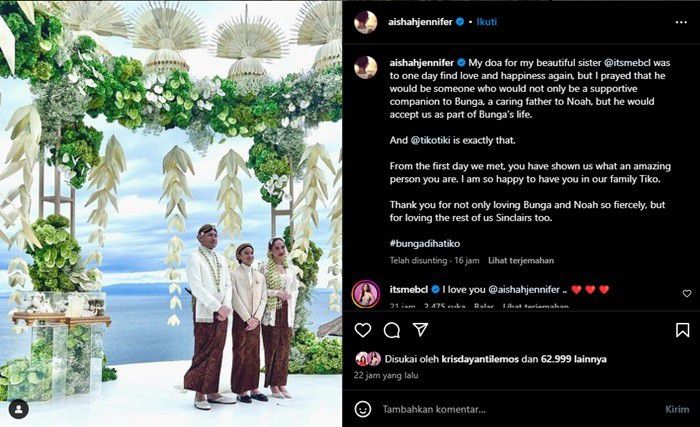 "Doaku untuk saudariku yang cantik @itsmebcl adalah suatu hari nanti dia bisa menemukan cinta dan kebahagiaannya lagi. Tapi aku berdoa bahwa pria itu mestilah seseorang yang bukan hanya menjadi pendamping yang suportif ke Bunga," ungkap Aishah Sinclair.