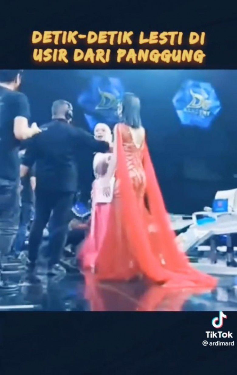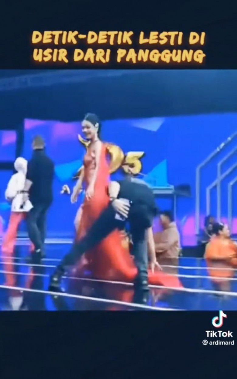 5. Kru TV ini terlihat meminta Lesti untuk turun panggung. Lesti pun meninggalkan panggung didampingi dua kru TV tersebut.
