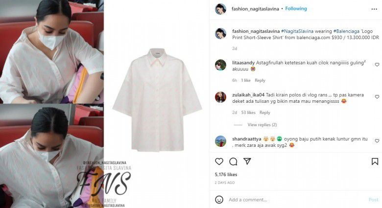 Nagita Slavina terlihat santai dengan kemeja berwarna putih. Banyak netizen yang salah fokus karena kemeja tersebut tampak sedikit lecek. Meski begitu, sekilas kemeja tersebut terlihat polos biasa. Tapi jika diperhatikan, di seluruh bagian baju terdapat tulisan pink dengan nama brand yakni Balenciaga.