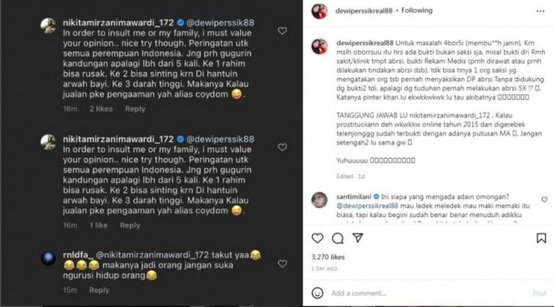 Ya, Nikita menuduh Dewi Persik pernah melakukan aborsi. Tuduhan itu terlihat dari salah satu komentar Nikita dalam Instagram. Namun saat ini komentar itu telah dihapus.
