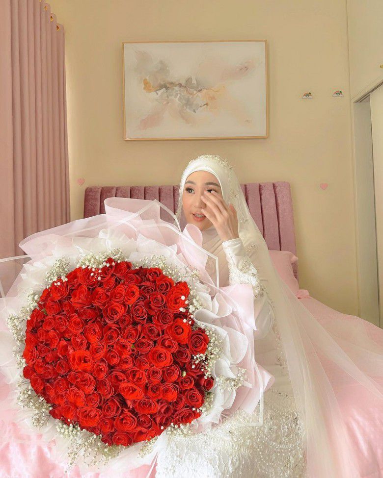 Larissa juga mengunggah foto-foto pernikahannya dengan pria yang telah dipilihnya tersebut. Salah satu unggahan menampilkan dia mengenakan baju pengantin dan membawa buket bunga raksasa yang didominasi mawar merah dalam jumlah banyak.