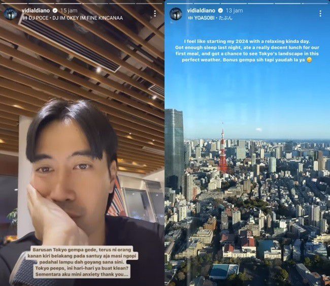 "Barusan Tokyo gempa gede, terus ni orang kanan kiri belakang pada santuy aja masi ngopi padahal lampu dah goyang sana sini. Tokyo peeps, ini hari-hari ya buat klean? Sementara aku mini anxiety thank you," tulis Vidi Aldiano.