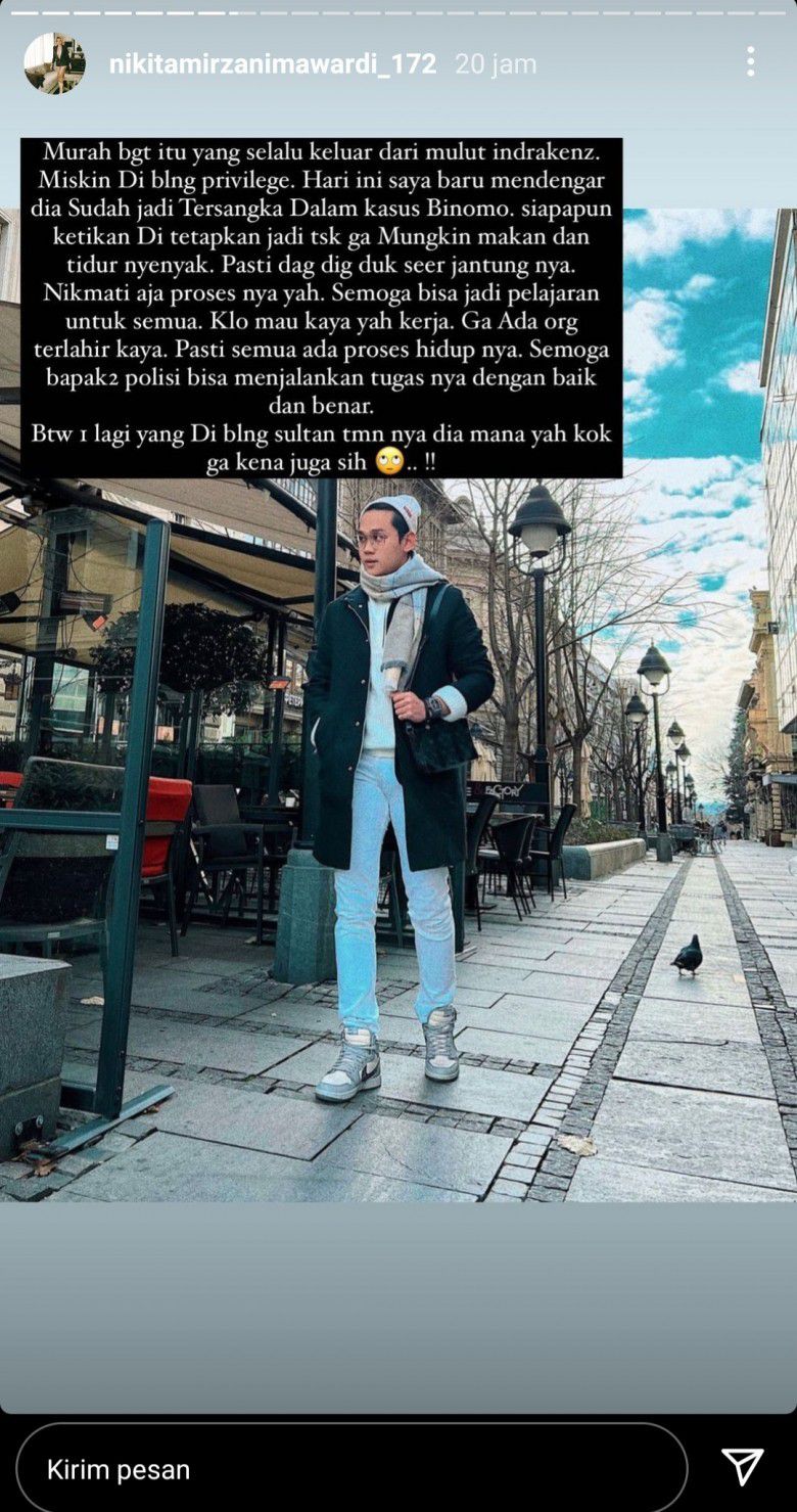 Kabar Indra Kenz tersangka ini rupanya ikut ditanggapi oleh Nikita Mirzani . Melalui Instastory-nya, Nikita membagikan salah satu foto Indra saat berlibur. Mengiringi unggahannya, ibu tiga orang anak itu menyoroti sikap Indra Kenz yang kerap merendahkan orang lain.