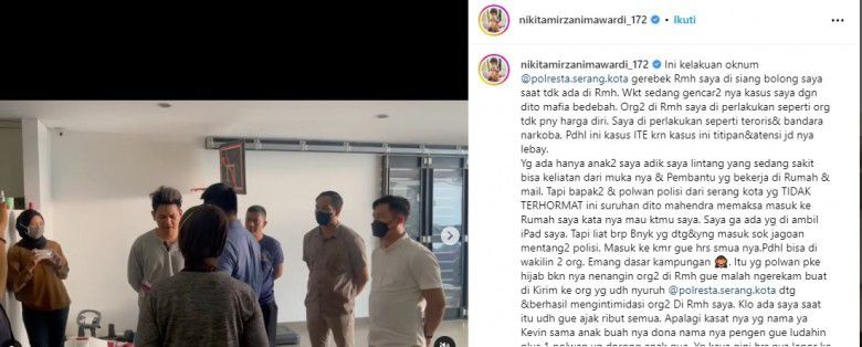 Dalam tulisannya di Instagram, Nikita Mirzani mengatakan bahwa polisi dari Polresta Serang masuk ke rumahnya pada siang hari ketika Nikita Mirzani tidak ada di rumah. “Org2 di Rmh saya di perlakukan seperti org tdk pny harga diri,” tulis Nikita Mirzani.