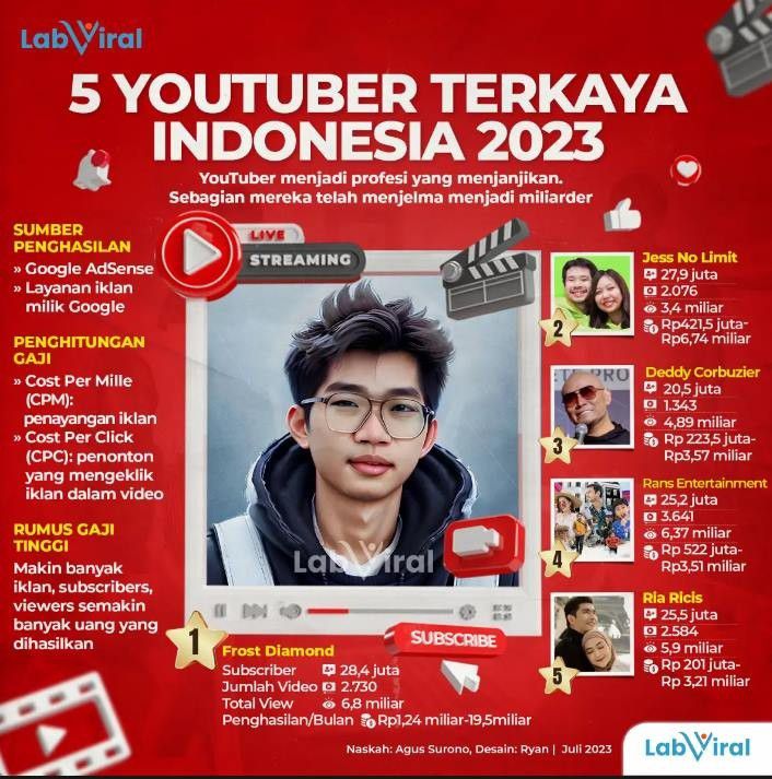 Sementara itu, sosok yang menempati posisi pertama YouTuber terkaya di Indonesia adalah Frost Diamond.