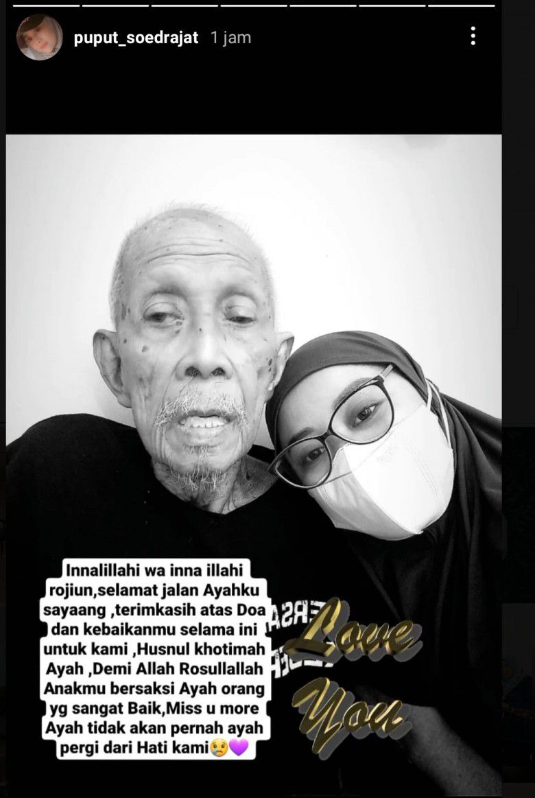 “Innalillahi wa inna illahi rojiun, selamat jalan ayahku sayang. Terima kasih atas doa dan kebaikanmu selama ini untuk kami. Husnul khotimah ayah, demi Allah Rosullallah anakmu bersaksi ayah orang yang sangat baik. Miss u more ayah, tidak akan pernah ayah pergi dari hati kami,” tulis Puput Sudrajat.