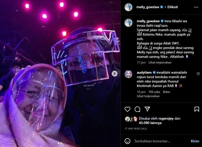 "Inna lillaahi wa innaa ilaihi raaji'uun. Selamat jalan mamih sayang, Insya Allah Ketemu Nike, mamah, papih ya mih. Bahagia di surga Allah SWT. Insya Allah engke pendak deui sareng Melly nya mih, urg jalan2 deui sareng mamah sareng Nike. Alfatihah," tulis Melly Goeslaw.