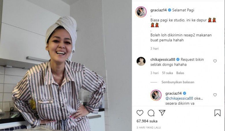 "Selamat pagi. Biasa ke studio, ini ke dapur. Boleh loh dikirimin resep2 makanan buat pemula hahah,"tulis Indri di caption foto. Dalam foto tersebut Indri terlihat santai, dia hanya mengenakan piyama dan handuk untuk menutupi bagian rambutnya.