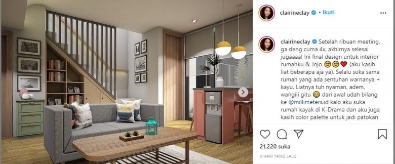 "Akhirnya selesai jugaaaa! Ini final design untuk interior rumahku & Jojo. Selalu suka sama rumah yang ada sentuhanwarnanya ditambah kayu. Liatnya tuh nyaman, adem, dan wangi gitu," tulis Clairine.