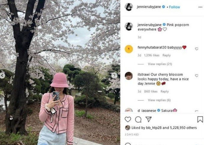 Tak lupa, ia menuliskan sebuah caption berupa pink popcorn everywhere, yang mengartikan bunga sakura yang ada dimana-mana. Dalam foto tersebut, tampak Jennie sedang mengenakan cardigan yang memiliki warna serupa dengan topinya.