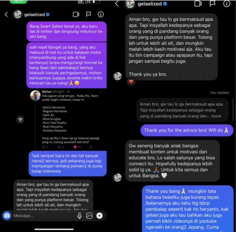 Mendapat respons tersebut dari Sean Gelael, Jerome pun langsung mengklarifikasi dan menghubungi sang pembalap langsung lewat DM Instagram.