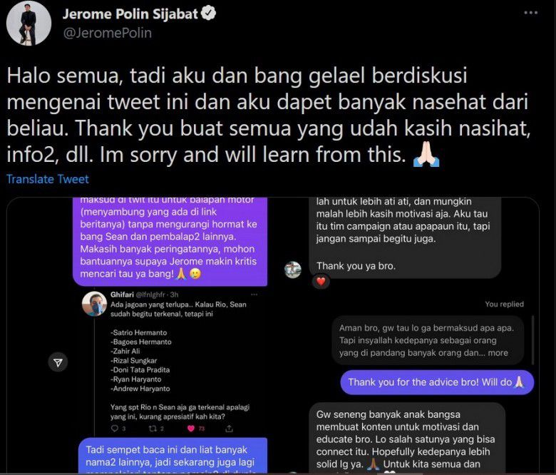 Lewat pesan pribadi di Instagram, Jerome Polin minta maaf dan menjelaskan ke Sean bahwa ia cuitannya dimaksudkan untuk balapan motor. Ia juga berjanji ke Sean untuk lebih kritis dalam mencari tahu sebelum bicara, terutama karena kini ia seorang publik figur.