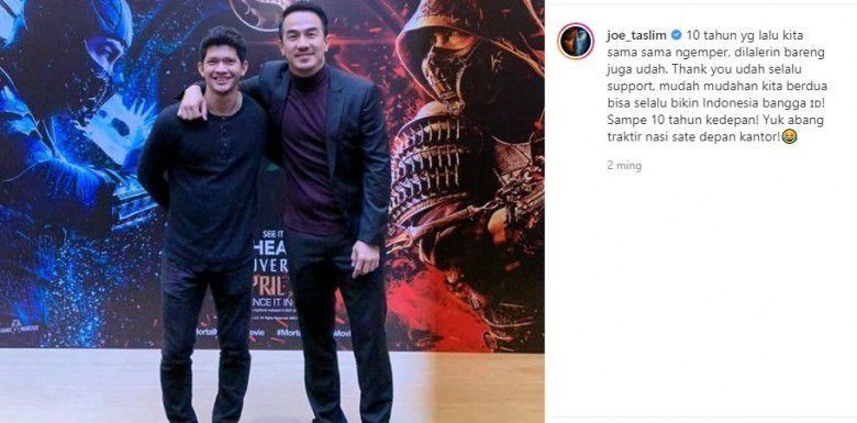 Dalam foto itu Joe dan Iko terlihat dalam sebuah bioskop untuk saksikan Mortal Kombat, film yang dibintangi Joe. "10 Tahun yang lalu kita sama-sama ngemper, dilalerin bareng juga udah,"tulis Joe.
