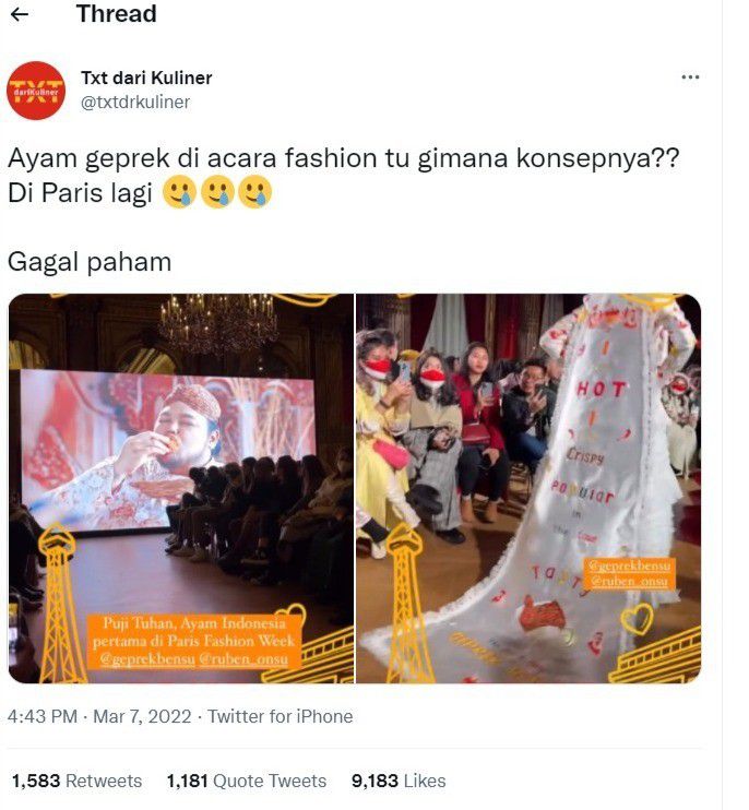 "Ayam geprek di acara fashion tu gimana konsepnya?? Di Paris lagi